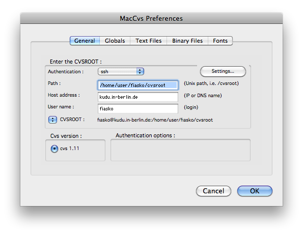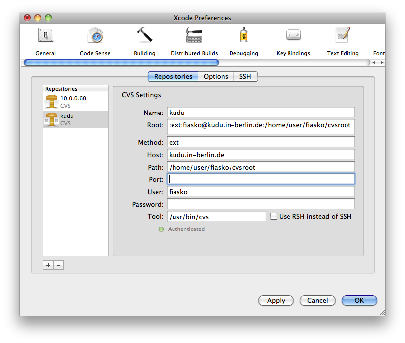 Authentication: ssh Path: /cvsroot Host address: kudu.in-berlin.de User name: fiasko