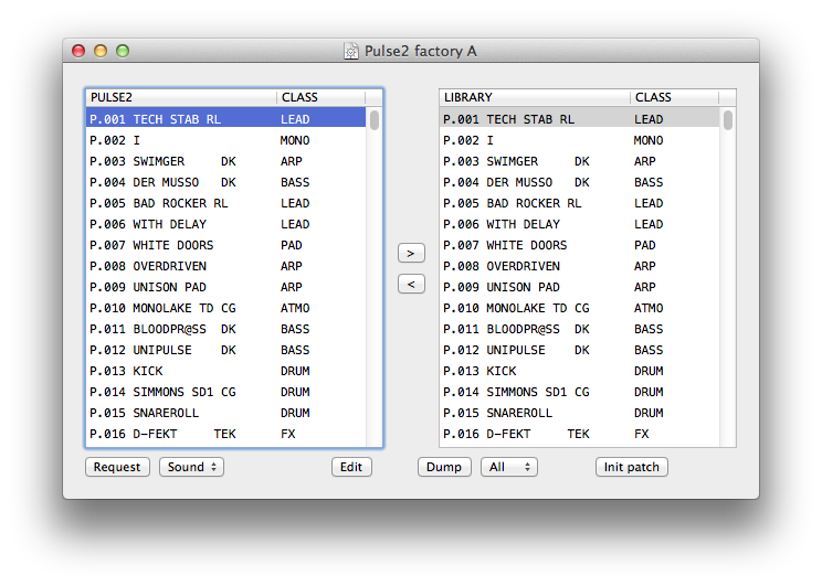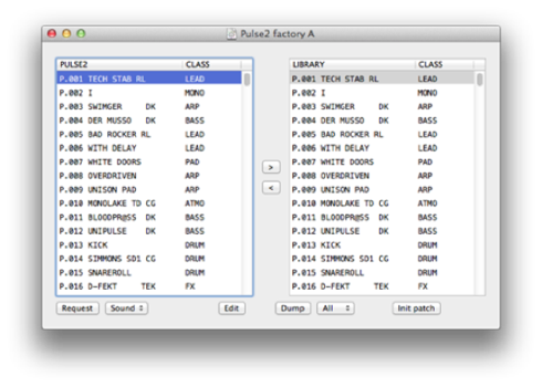A sound bank can be opened, for instance "Pulse2 factory 09.09.13.mid" and all sounds can be dumped to the Pulse2 afterwards.